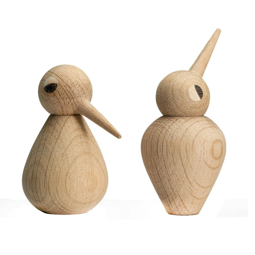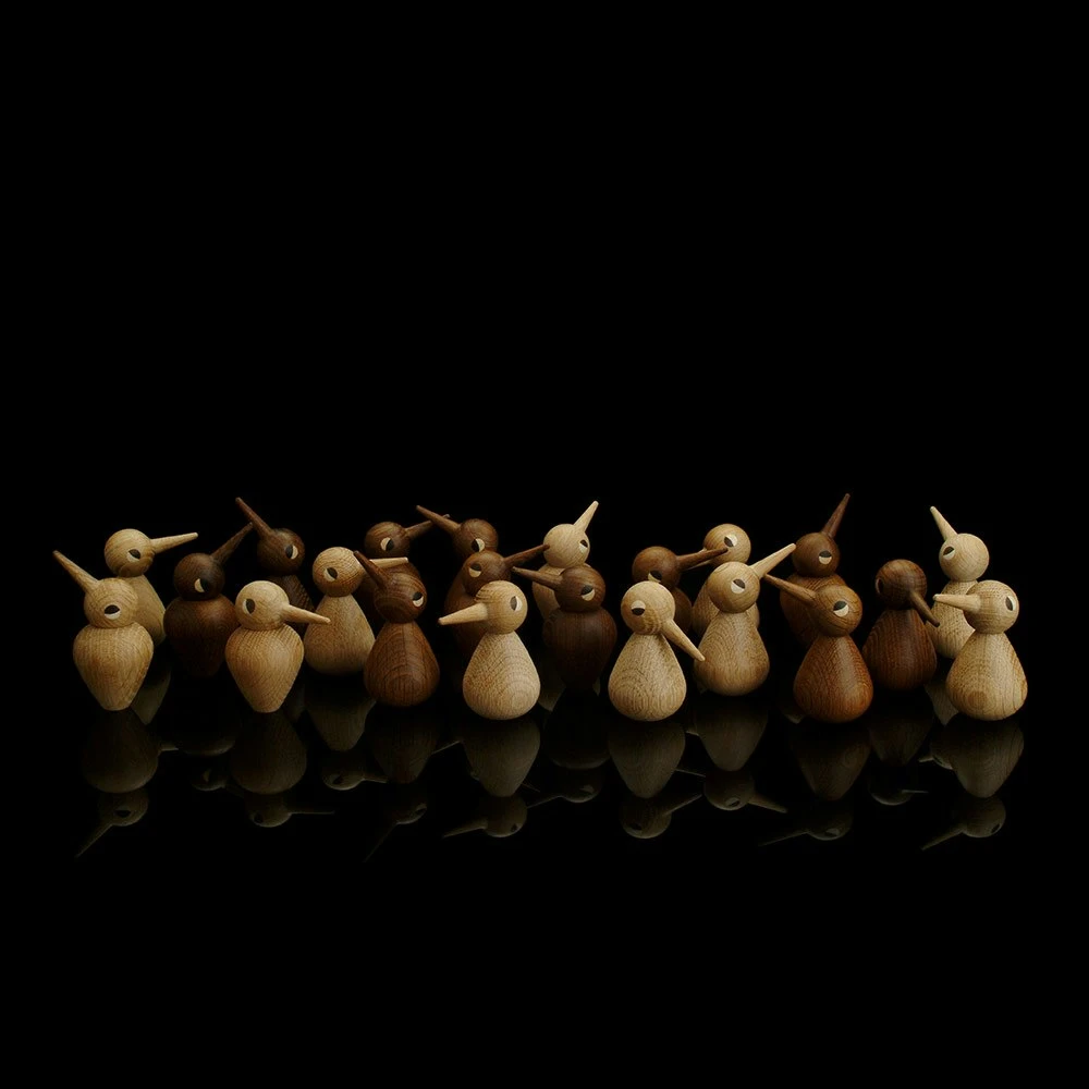 Die klassische Vogel-Familie von BIRD mit Kindern, Eltern und Großeltern sind erhältlich aus dunkler und heller Eiche.Der Kopf und der Körper der Vögel kann gedreht werden.