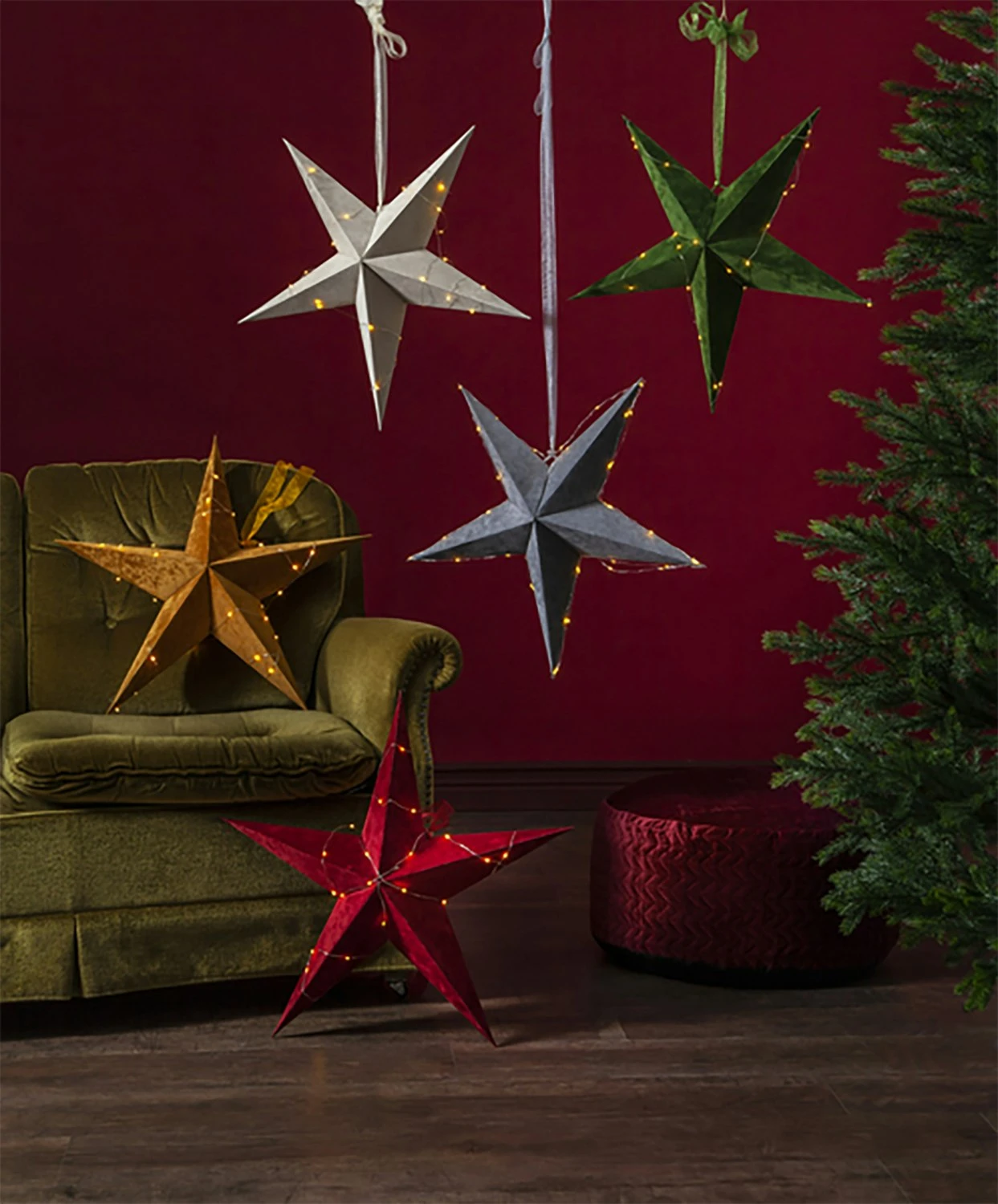 Beautiful velvet star with associated Dew Drop light trail from Star Trading. A flexible star that can either be hung in a window or placed against a wall on a sideboard. A cozy interior decoration for the home that gives a lovely Christmas feeling. The loop gives a warm white and comfortable glow. The star is equipped with a timer that means you turn it on once, and then it glows for six hours and then lights up the same time the next day again. Powered with AA-batteries purchased separately.